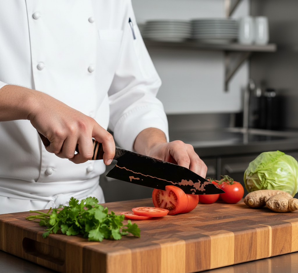 This chef knife is full tang, ensuring strength, stability, and perfect weight balance between the blade and handle. Its 60–62 HRC hardness makes it tough enough for daily use while maintaining flexibility for effortless cutting.