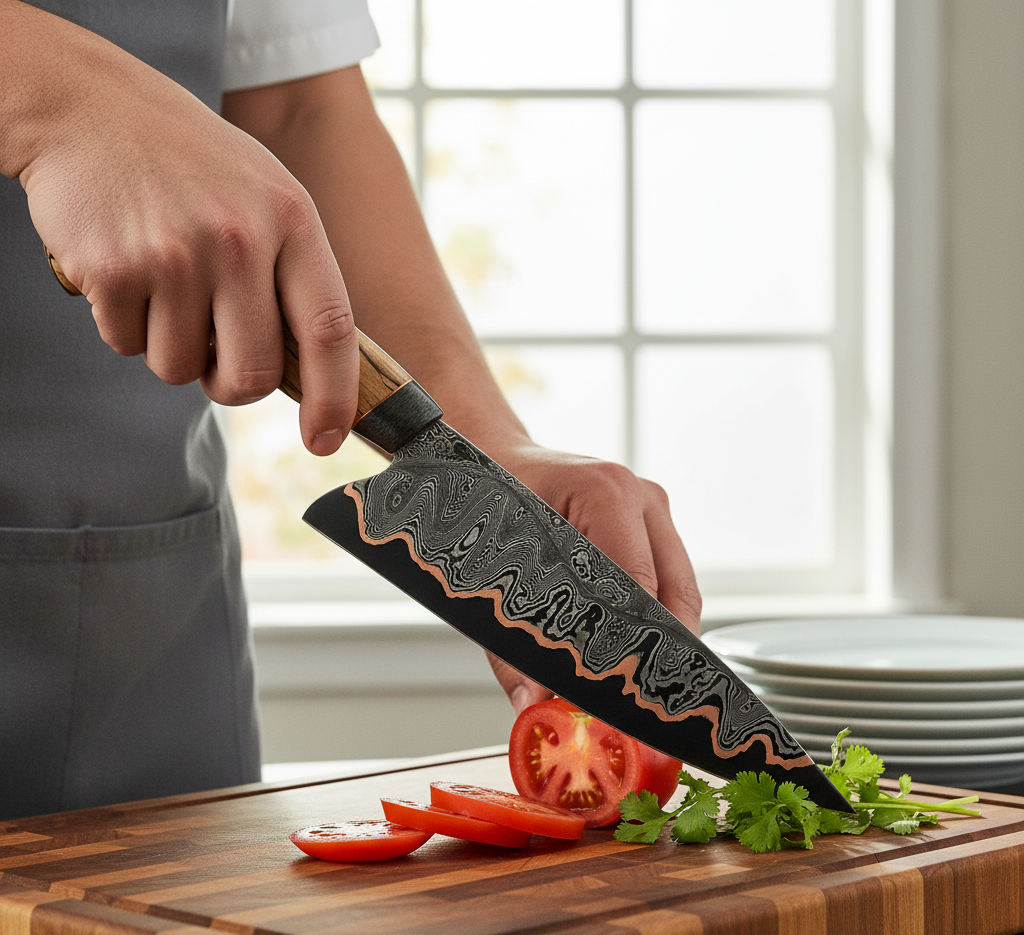 The ergonomic handle, made from stabilized wood, olive wood, or resin, provides a comfortable, non-slip grip — reducing fatigue during long cooking sessions. Each handle is carefully fitted and polished for a luxurious finish, giving you full control and precision while cutting.