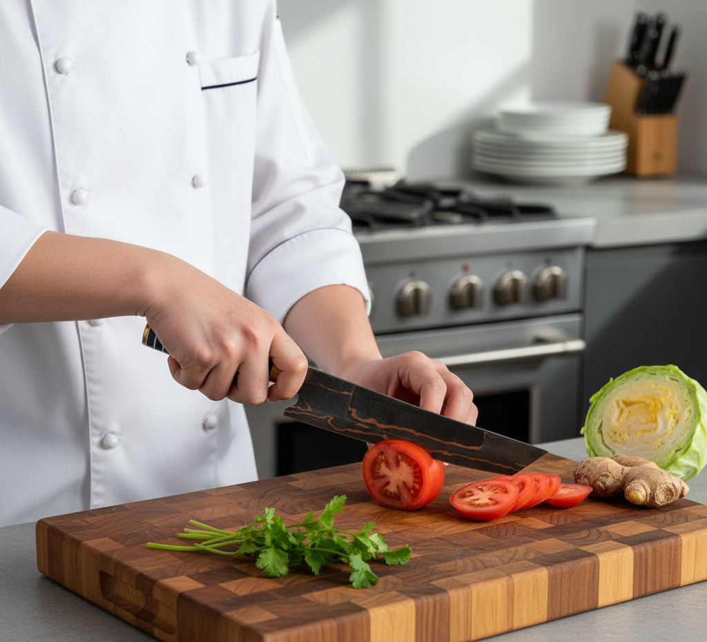 This chef knife is full tang, ensuring strength, stability, and perfect weight balance between the blade and handle. Its 60–62 HRC hardness makes it tough enough for daily use while maintaining flexibility for effortless cutting.